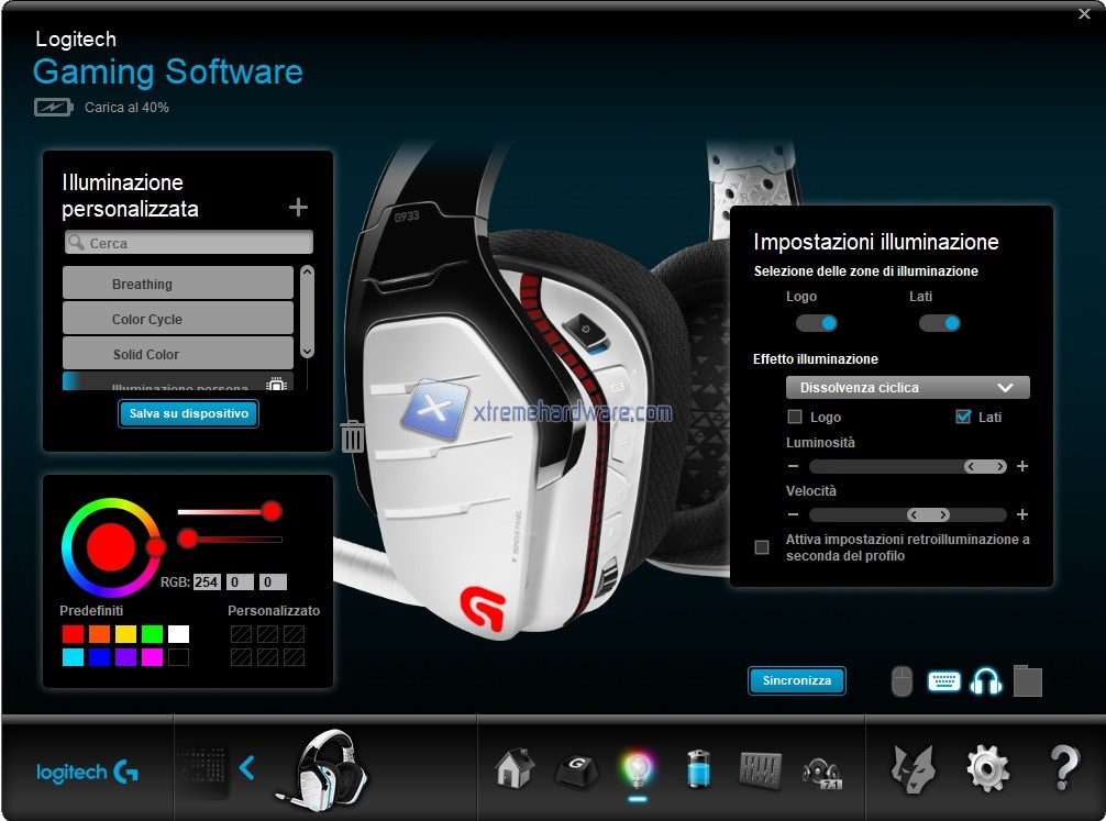 Passiamo all’icona per la personalizzazione della retroilluminazione RGB e relativi effetti. Logitech ci mette a disposizione abbastanza voci per la personalizzazione tra cui la sincronizzazione cromatica tra diverse periferiche compatibili Logitech.