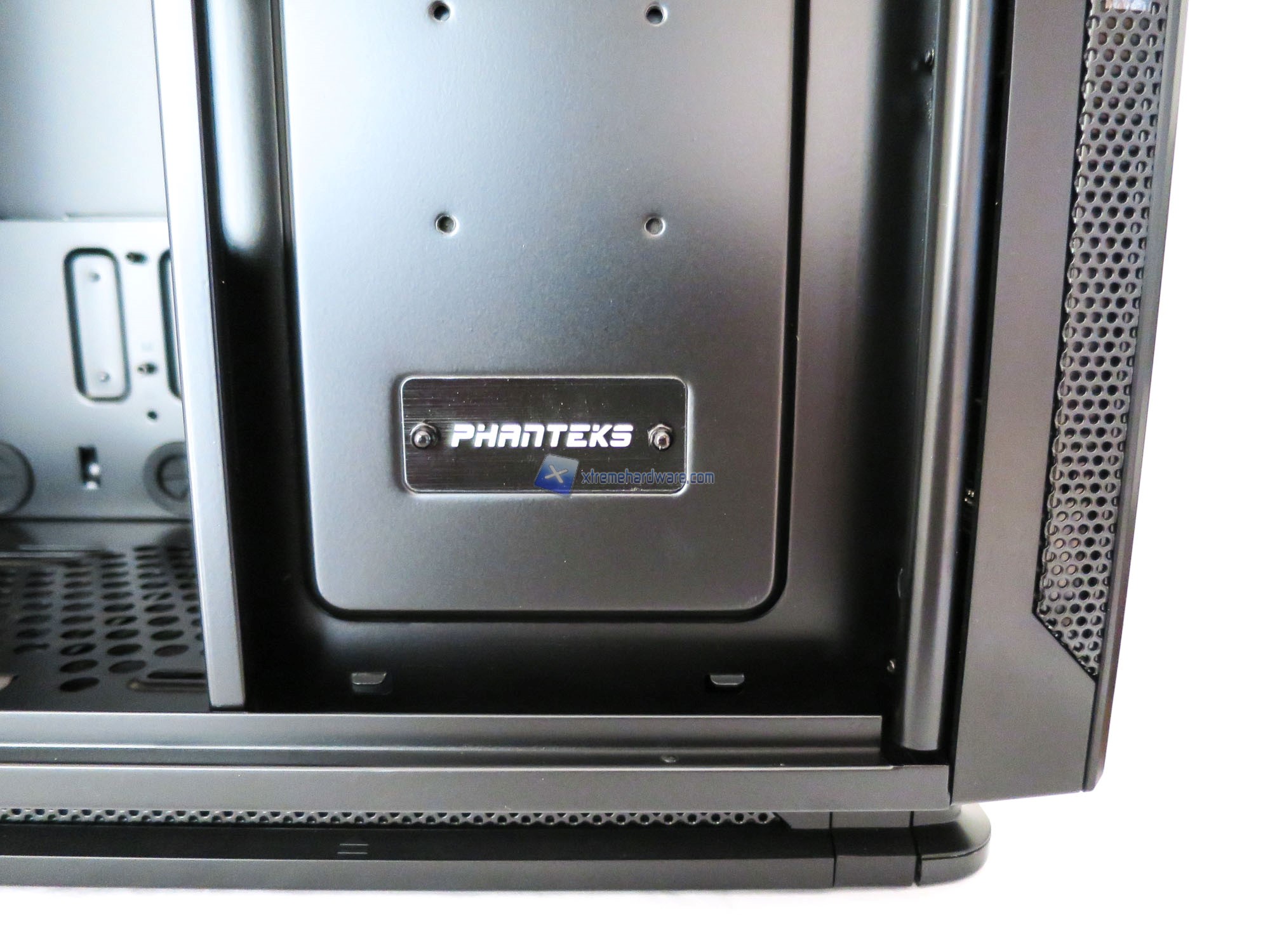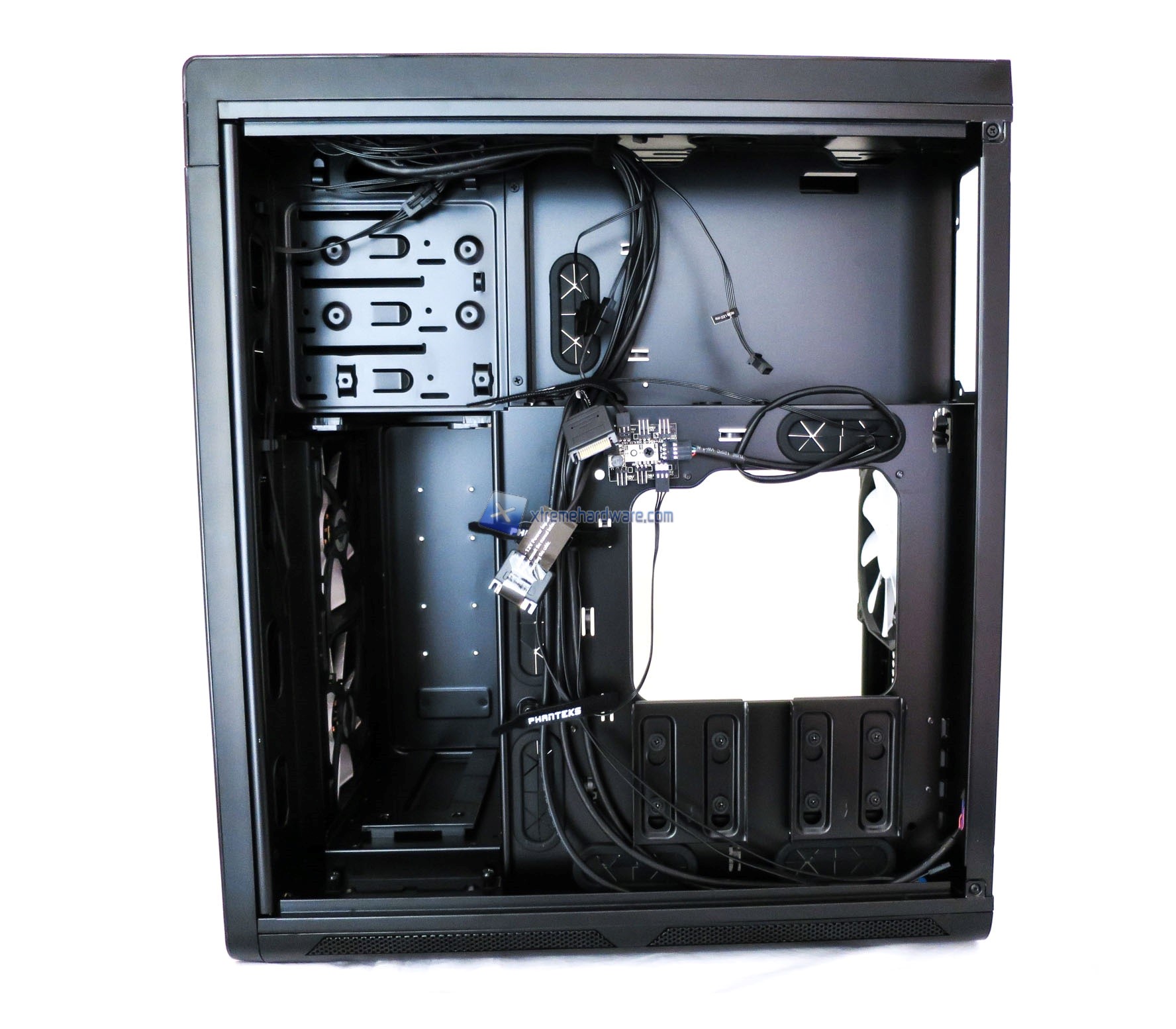 A lato di tali fori trova posto la struttura che ospiterà i due cage per Hard Disk removibili. Tale struttura nel lato frontale interno ha anche una cover con la targhetta Phanteks che rende non solo pulito il design ma completa anche la qualità generale del prodotto già di per se ottima. Essendo un po' tutto il case ‘’modulare’’ potremo facilmente rimuovere tale cover nel caso non vi piaccia (tramite pratiche viti laterali).