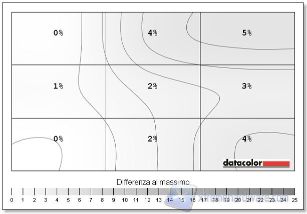 Suddividendo lo schermo in nove rettangoli, abbiamo misurato con il colorimetro l’uniformità della luminosità e dei colori. La differenza massima registrata è risultata pari al 5%, con una media del 2,3%, per quanto riguarda la luminosità, mentre per il colore, il Delta-E maggiore è stato di 4,7, con una media del 2,4.