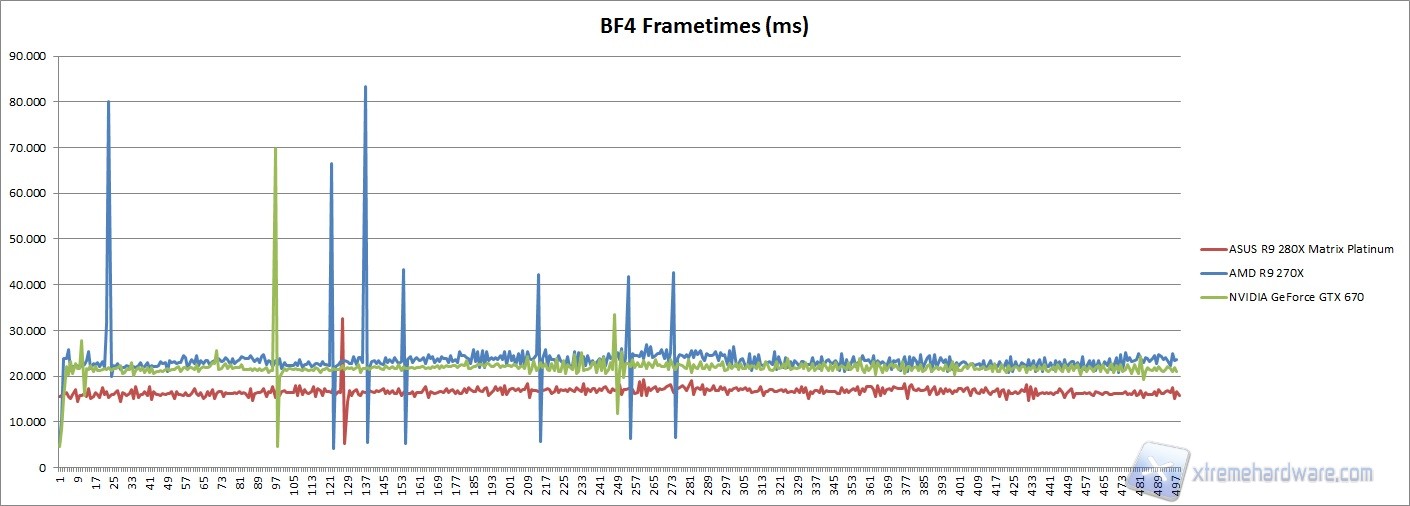 Abbiamo aggiunto per questo gioco anche un analisi dei frametimes, sull'asse delle ordinate vengono riportati i millisecondi per generare un frame, mentre sull'asse delle ascisse sono riportati i frame campione. Il miglior risultato è ottenuto dalla scheda che ha meno oscillazioni sull'asse dei millisecondi. Ecco a voi il grafico: